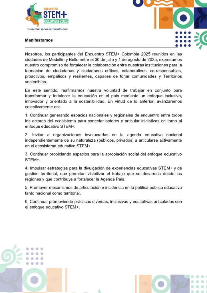 A continuación, te presentamos el manifiesto del primer Encuentro STEM+ Colombia: